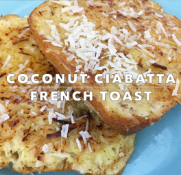 Ciabatta rolls are so delicious and versatile. I buy them by the bag so sometimes they can become stale before I can use them. That makes them PERFECT for French toast! Way, way back in the past, dousing bread in milk, eggs, and spices was how they were able to keep the bread from being wasted. Nowadays, we don’t usually wait for a hard heel of a scrap of bread to create such a yummy treat. You’re going to love this version especially if you’re a coconut fan!