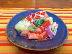As per the “rules” of the menu, the name was a snap, a la our “True Grits” for “True Grit” a few years back. This would be a tomato salad but it had to connect to the movie so I simply added jalapeño peppers. A little sexy heat is very Mexican – the food, the people… YES! The dressing is my nod to our southern cuisine theme and works wonderfully! It’s flavorful and cool to complement not only this salad but the dishes leading up to this.
