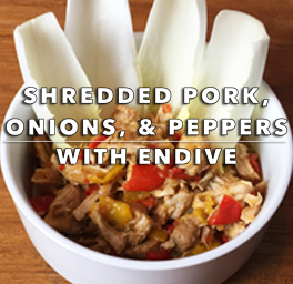 I love using endive as an edible utensil. The leaves are sturdy enough to handle the shredded pork, and their bright flavor and crunch are the perfect counter to the touch of heat. Of course you could always nix the endive in favor of egg noodles or make a sandwich from it! Yeah! Served as a chic appetizer or a substantial entree, this dish works wonderfully. You’ll want to en-DIVE right in! Ha!