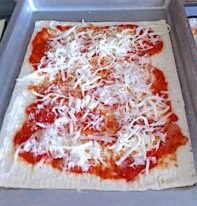 2) Preheat oven to 350°. On a baking pan, put a piece of Lavash bread. Ladle your sauce over the top. Add the mozzarella & grated cheese. Put it in the oven for about 10 minutes until the cheese is all melty and gooey.