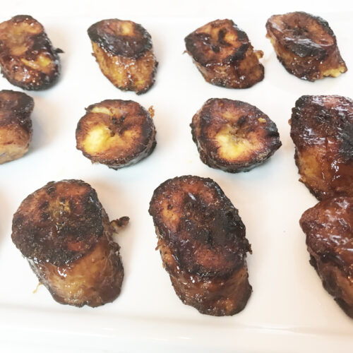 - In a non-stick pan, add the butter and sugar and mix until it starts to thicken, about 2-3 minutes. Add the plantains to the pan and cook for about 2-3 minutes or until they're brown on both sides.